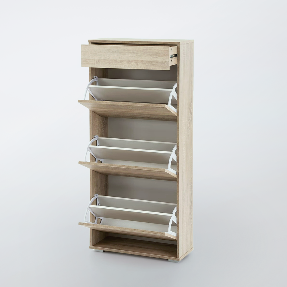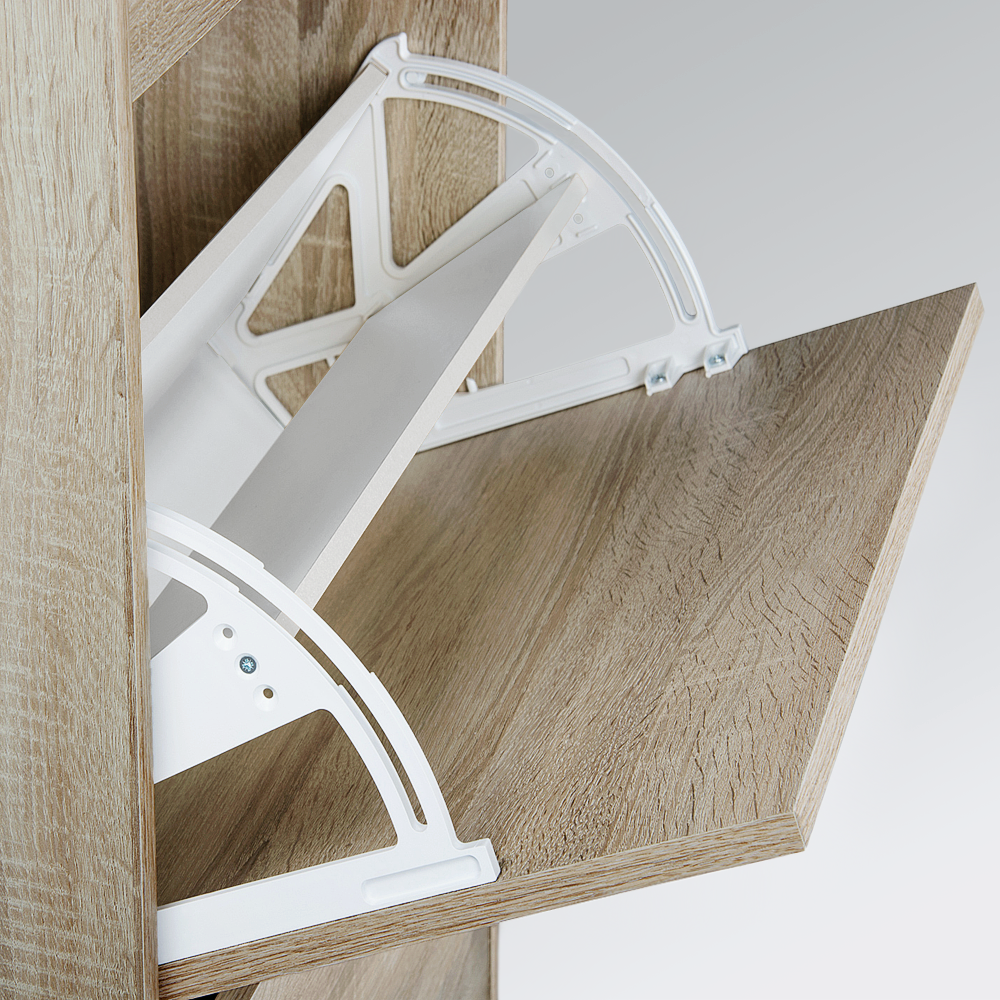Dvojradový výklopný systém umožňuje prehľadné uloženie viacerých párov topánok, zatiaľ čo horná zásuvka poslúži na drobnosti ako kľúče, krémy či doplnky. Botník stojí na plastových nožičkách, ktoré uľahčujú údržbu podlahy.