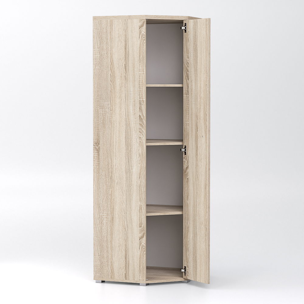 Vysoká rohová skriňa s univerzálnym otváraním dverí a tromi rohovými policami. V skrini sú pripravené otvory na osadenie viacerých políc. Preto si ďalšie police môžete podľa potreby dokúpiť a umiestniť v skrini tak, aby ste maximálne využili priestor, ktorý ponúka. Dvere skrine sa otvárajú pomocou drobnej kovovej úchytky.