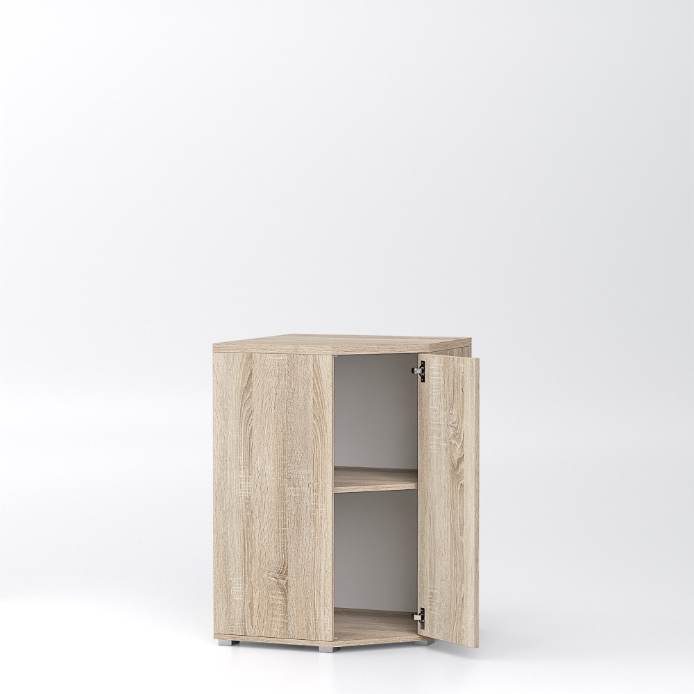 Skriňa s univerzálnym otváraním dverí a dvomi rohovými policami. V skrini sú pripravené otvory na osadenie viacerých políc. Preto si ďalšie police môžete podľa potreby dokúpiť a umiestniť v skrini tak, aby ste maximálne využili priestor, ktorý ponúka. Dvere skrine sa otvárajú pomocou drobnej kovovej úchytky. Nožičky sú vyrobené z pevného plastu, vysoké 2 cm a sú striebornej farby. Skriňa je vyrobená z kvalitnej laminovanej drevotrieskovej dosky hrúbky 16 mm, vrchná doska je z pevnej laminovanej drevotriesky hrúbky 25mm s kvalitnou 2 mm ABS hranou. Vybrať si môžete z desiatich krásnych dekorov skrine. Dodáva sa v demonte.