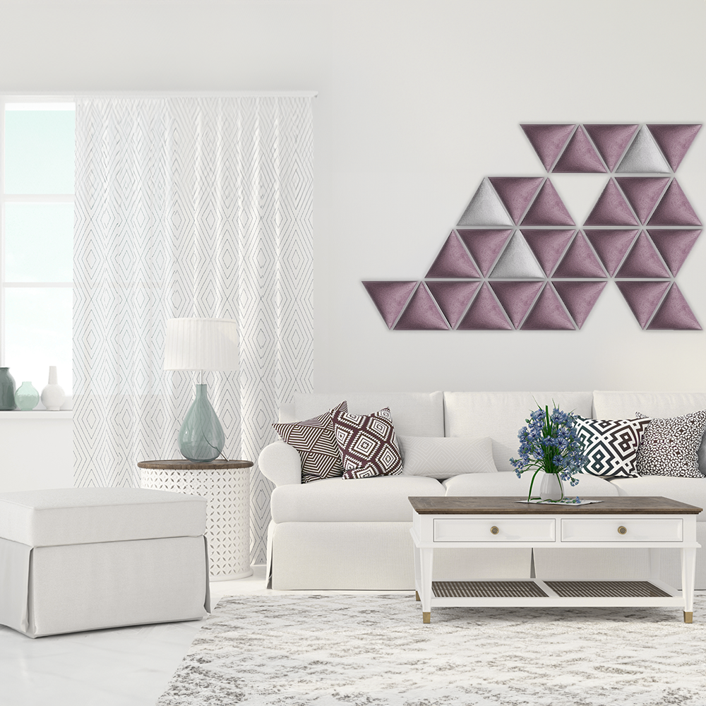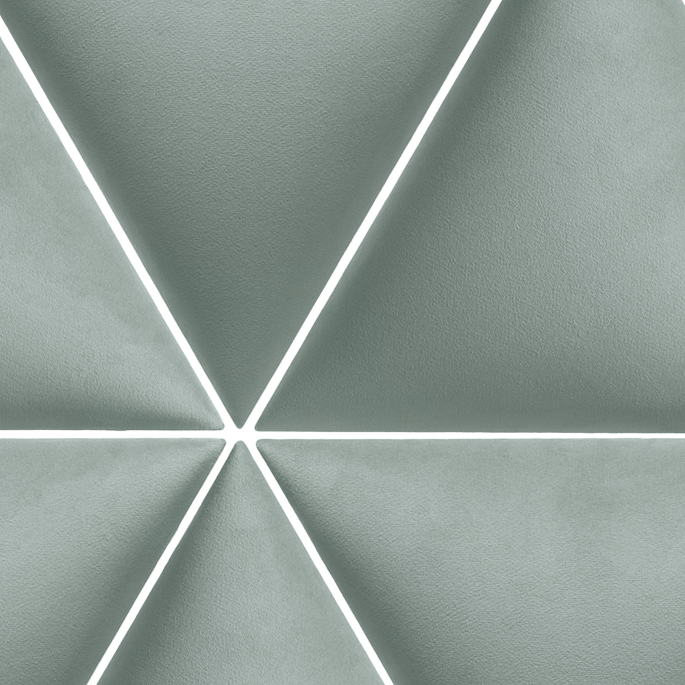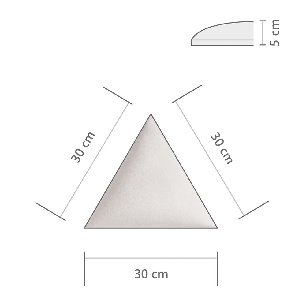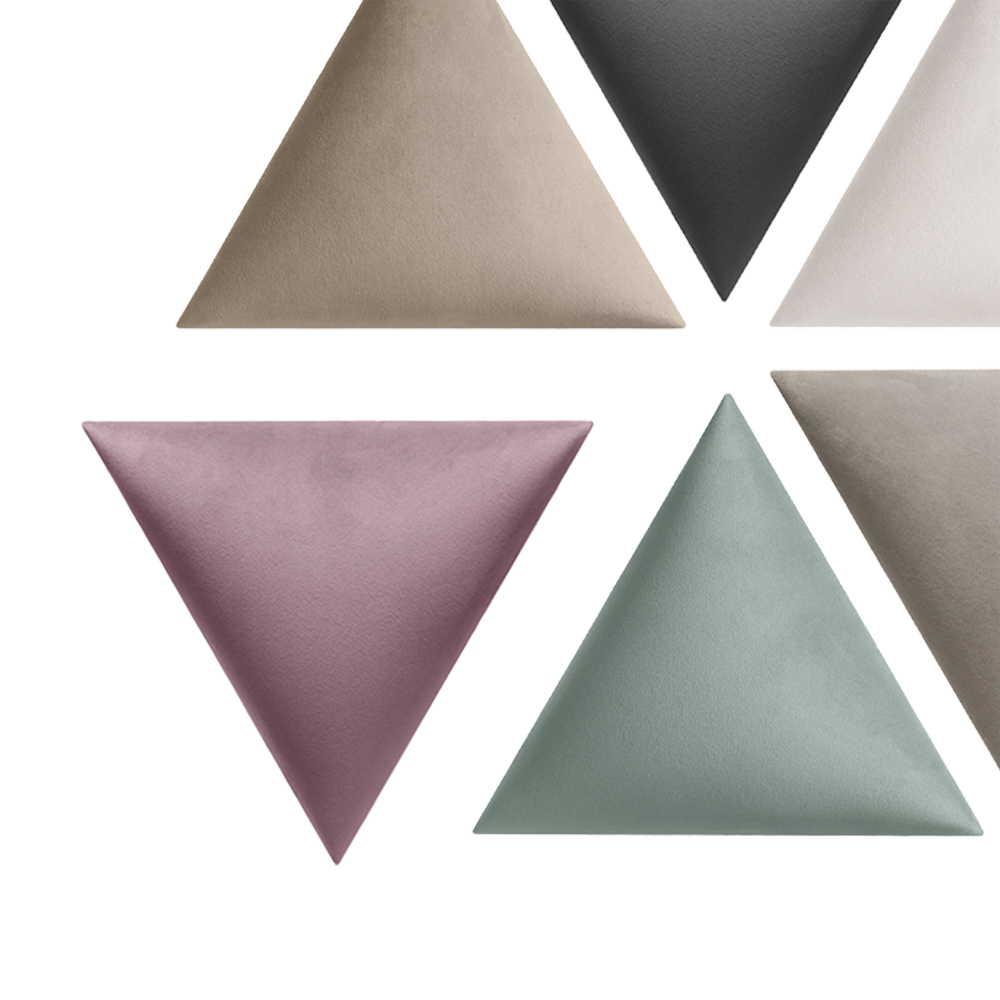 Nástenný čalúnený panel 30x30 cm v tvare trojuholníka. Panel jednoducho nalepíte na stenu pomocou priložených obojstranných nálepiek so suchým zipsom.