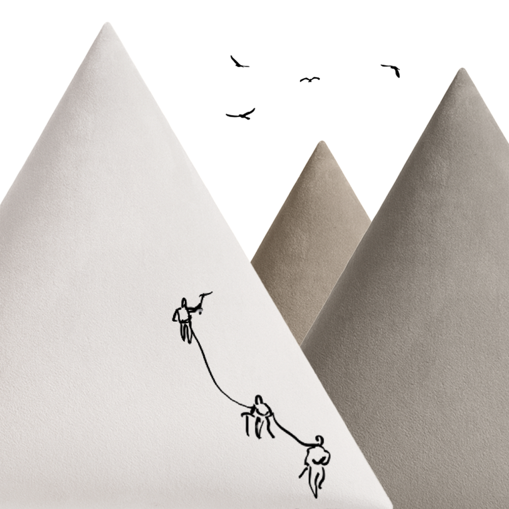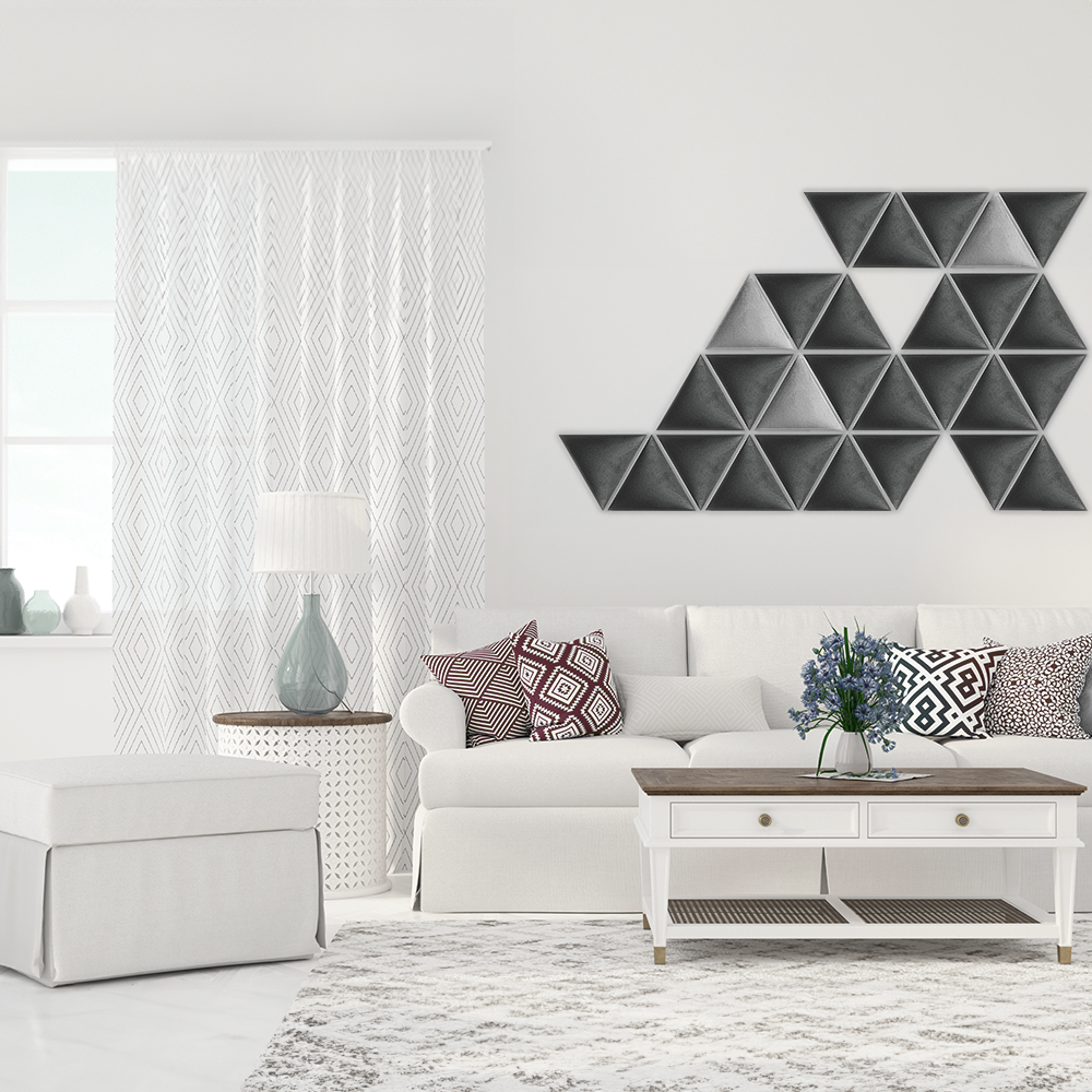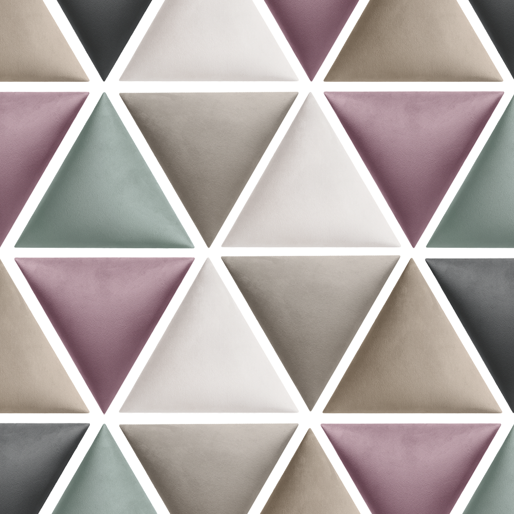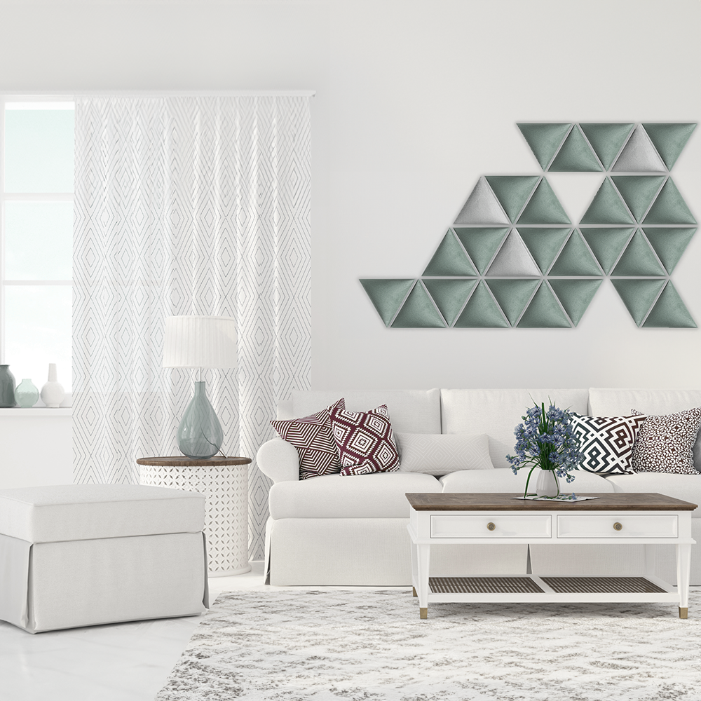 Nástenný čalúnený panel 30x30 cm v tvare trojuholníka. Panel jednoducho nalepíte na stenu pomocou priložených obojstranných nálepiek so suchým zipsom.