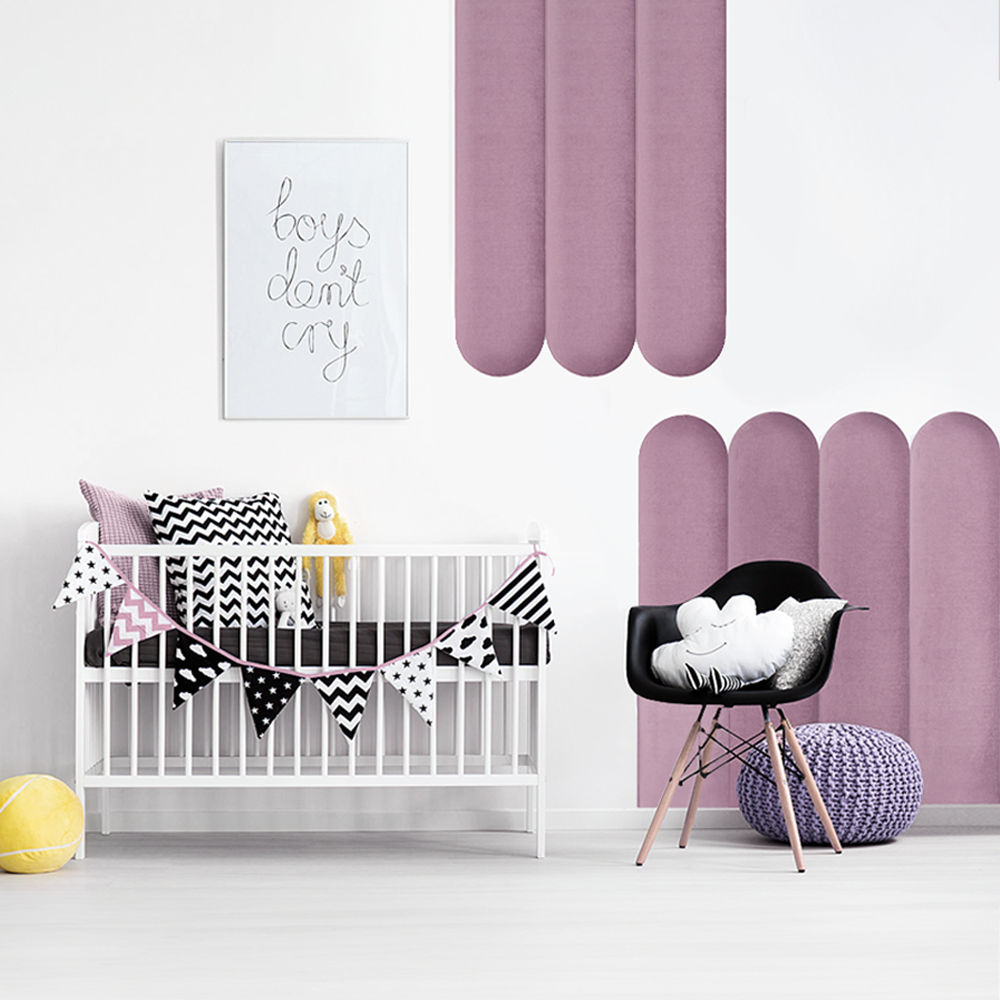 Nástenný čalúnený panel 30x130 cm v tvare piškótu. Panel jednoducho nalepíte na stenu pomocou priložených obojstranných nálepiek so suchým zipsom.