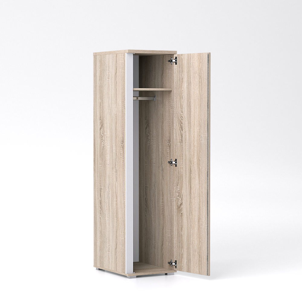Vysoká úzka skriňa s univerzálnym osadením dverí, jednou policou a vešiakovou tyčou. Police si môžete dokúpiť a umiestniť podľa vlastnej potreby.