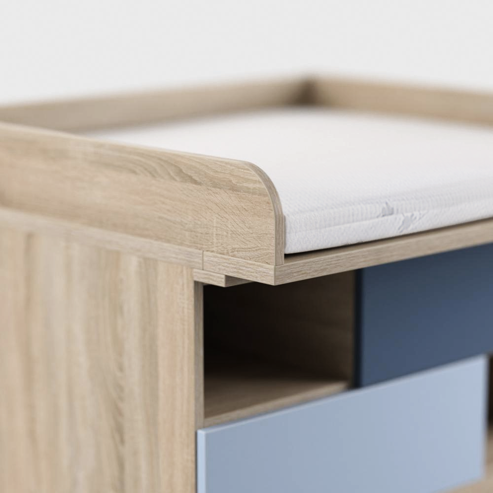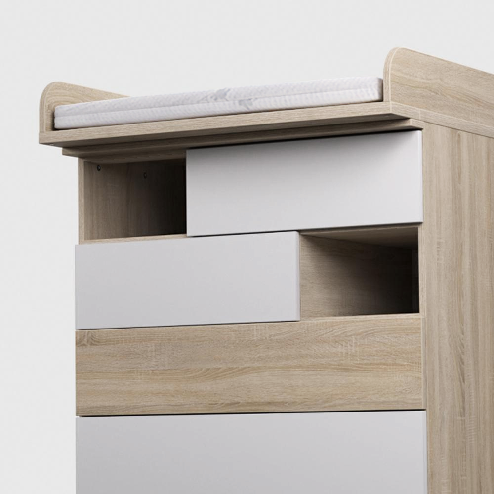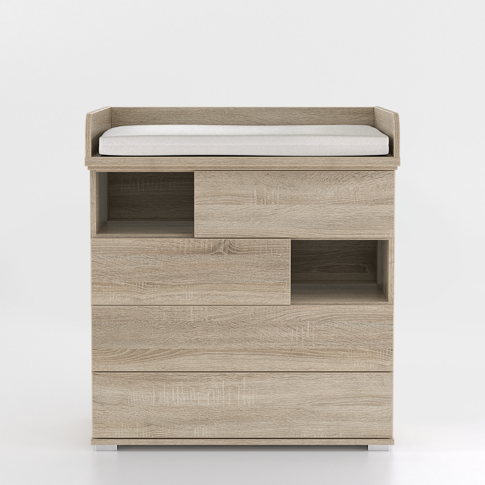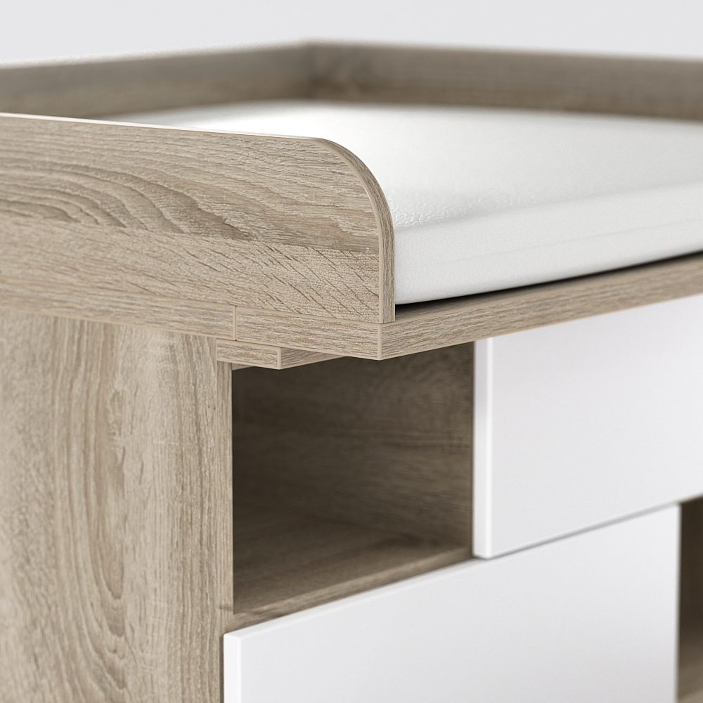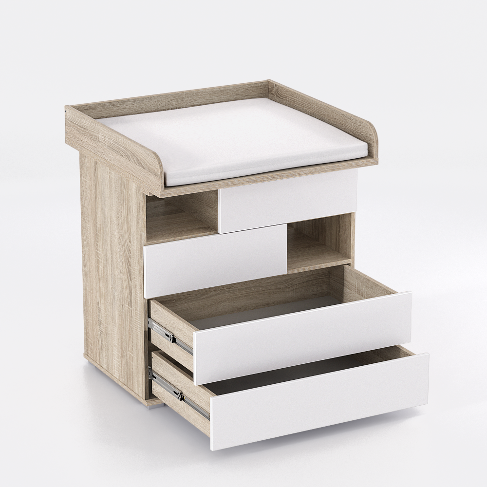 Samozrejmosťou komody je priestranný prebaľovací pult, ktorý je doplnený o mäkký matrac aby sa vaše bábätko počas prebaľovania cítilo čo najpríjemnejšie. Komoda je vyrobená z laminovaného dreveného DTD materiálu s hrúbkou 16 mm, ktorý nie je náročný na údržbu. Hrúbka ABS hrany tvorí 0,5 mm a 2 mm na prebaľovacej nadstavbe a dvierkach. Až vaše bábätko vyrastie prebaľovaciu nadstavbu môžete jednoducho demontovať a ostane vám klasická komoda, ktorá perfektne doplní váš interiér.