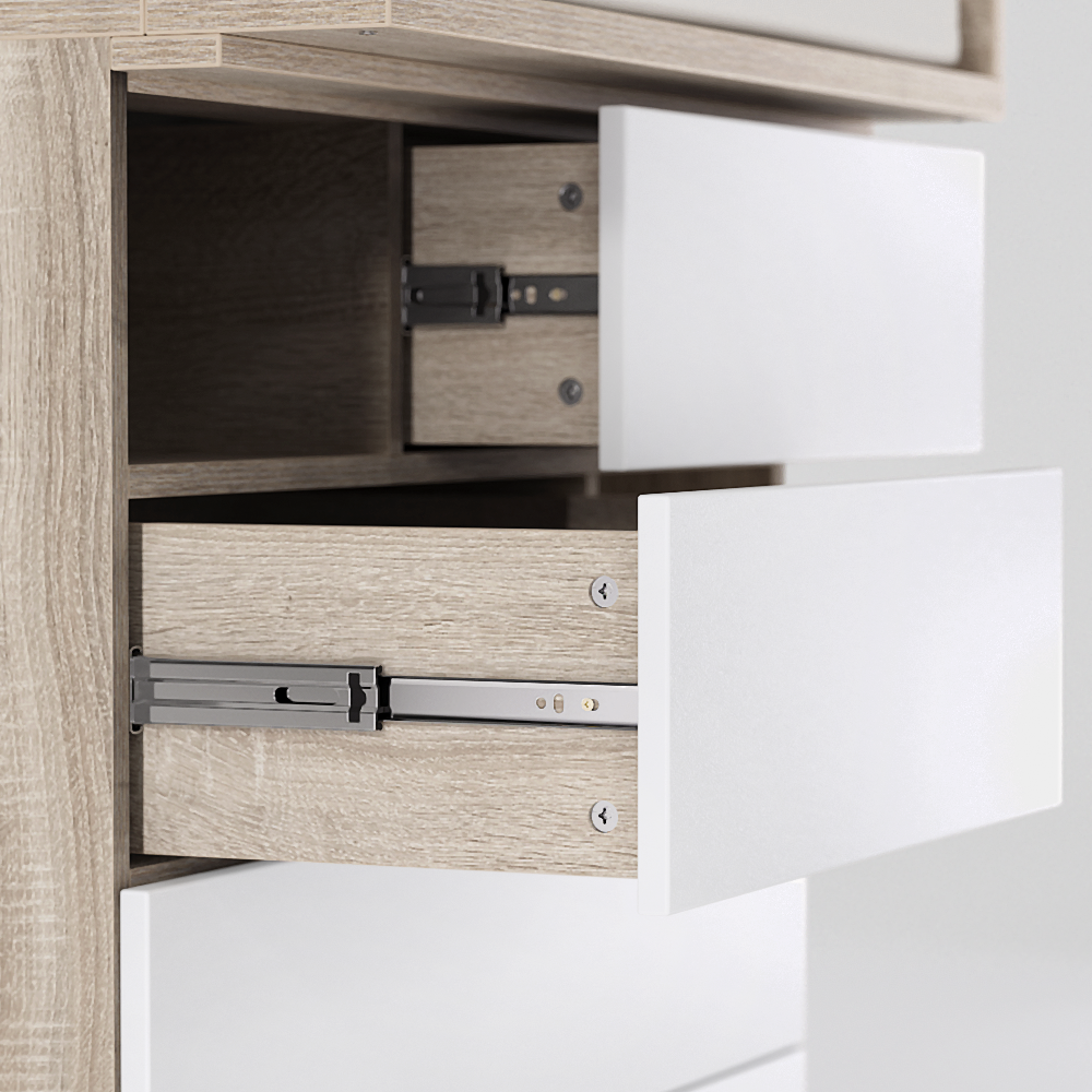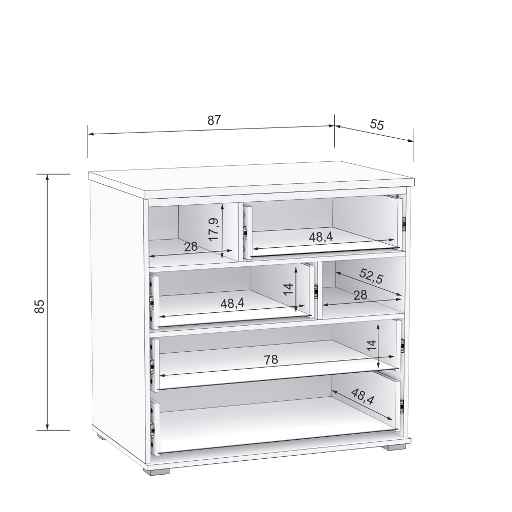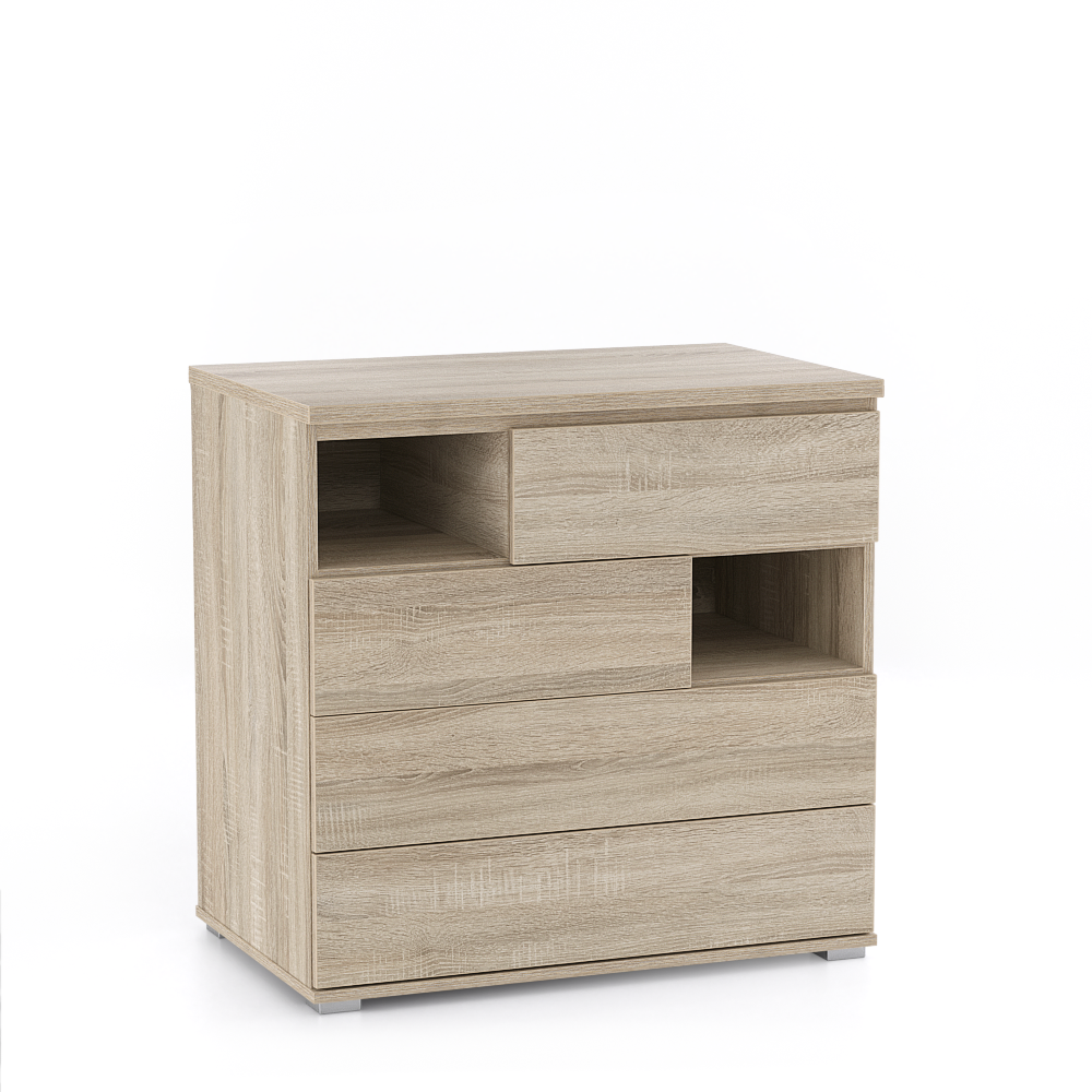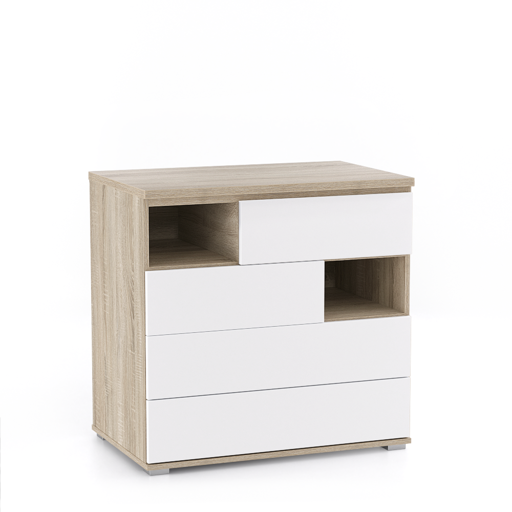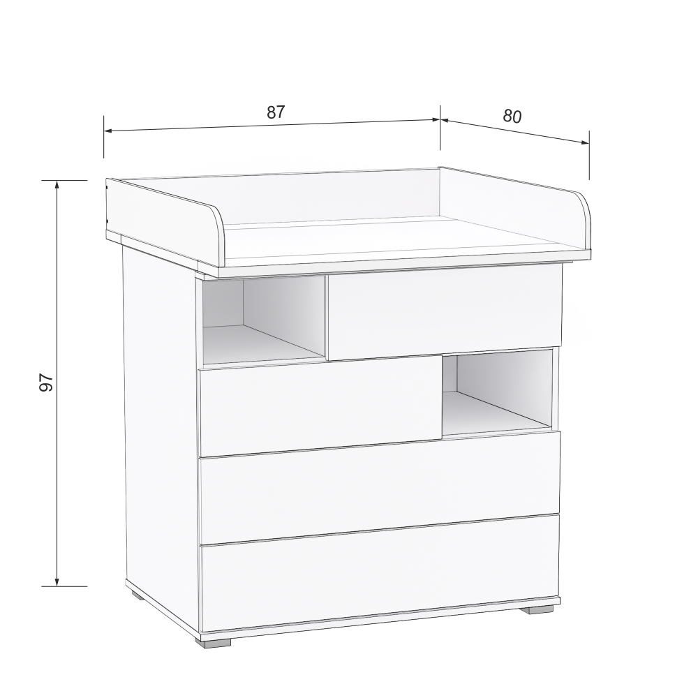 Samozrejmosťou komody je priestranný prebaľovací pult, ktorý je doplnený o mäkký matrac aby sa vaše bábätko počas prebaľovania cítilo čo najpríjemnejšie. Komoda je vyrobená z laminovaného dreveného DTD materiálu s hrúbkou 16 mm, ktorý nie je náročný na údržbu. Hrúbka ABS hrany tvorí 0,5 mm a 2 mm na prebaľovacej nadstavbe a dvierkach. Až vaše bábätko vyrastie prebaľovaciu nadstavbu môžete jednoducho demontovať a ostane vám klasická komoda, ktorá perfektne doplní váš interiér.