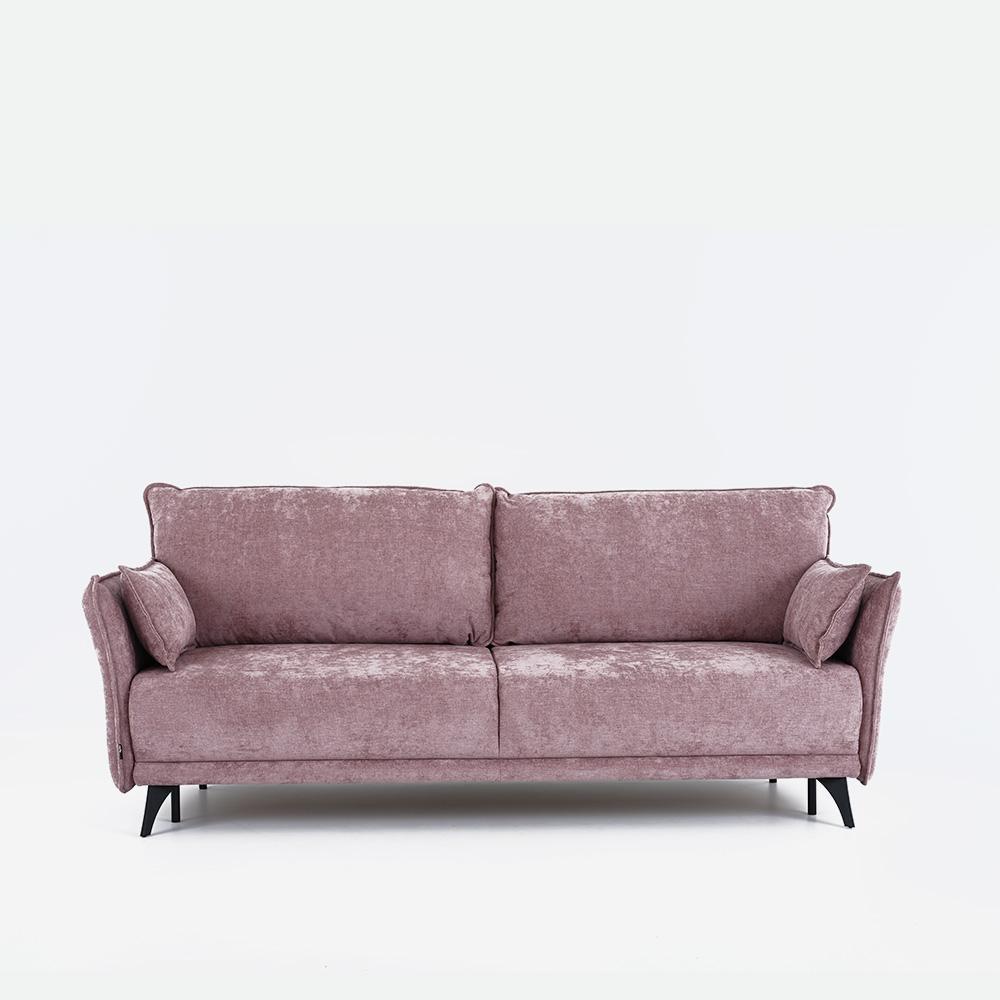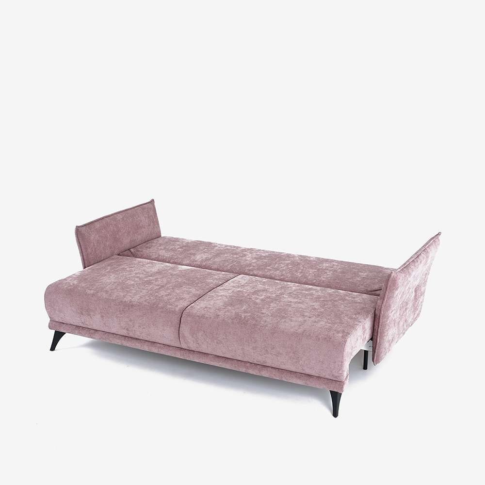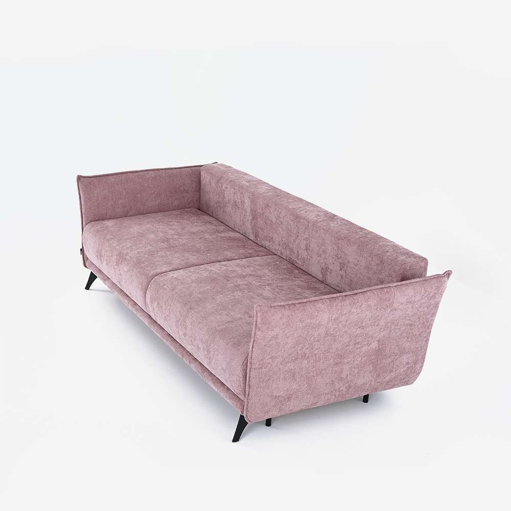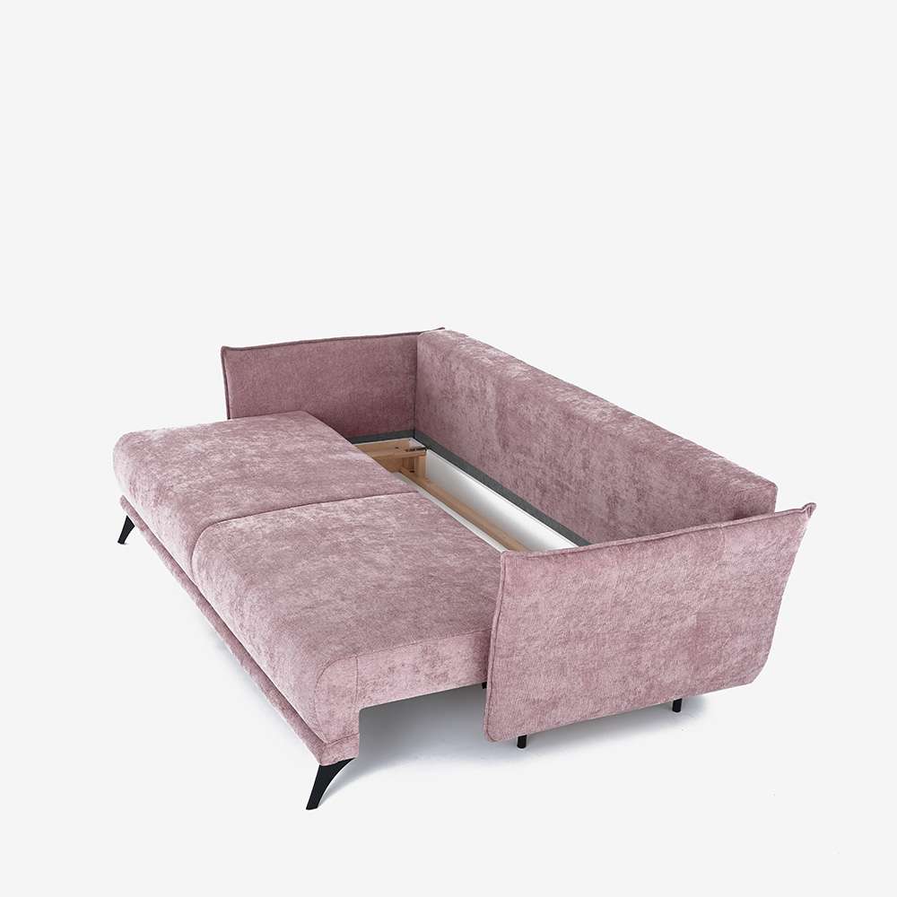 SARENZA 3 v ružovej látke Rosario 463 je štýlový trojsed s rozkladom a úložným priestorom. Moderný dizajn, komfort a miesto aj pre robotický vysávač.