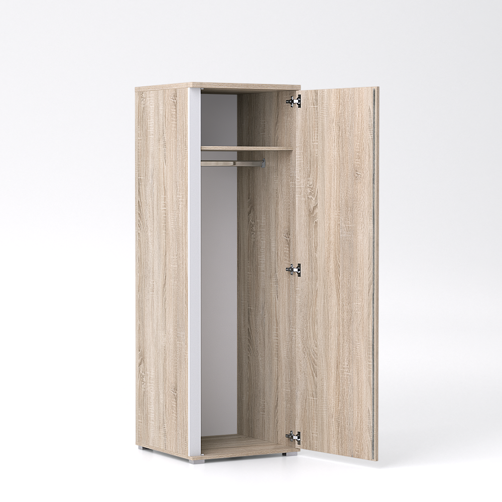 Vysoká skriňa s univerzálnym osadením dverí, jednou policou a vešiakovou tyčou. Police si môžete dokúpiť a umiestniť podľa vlastnej potreby.