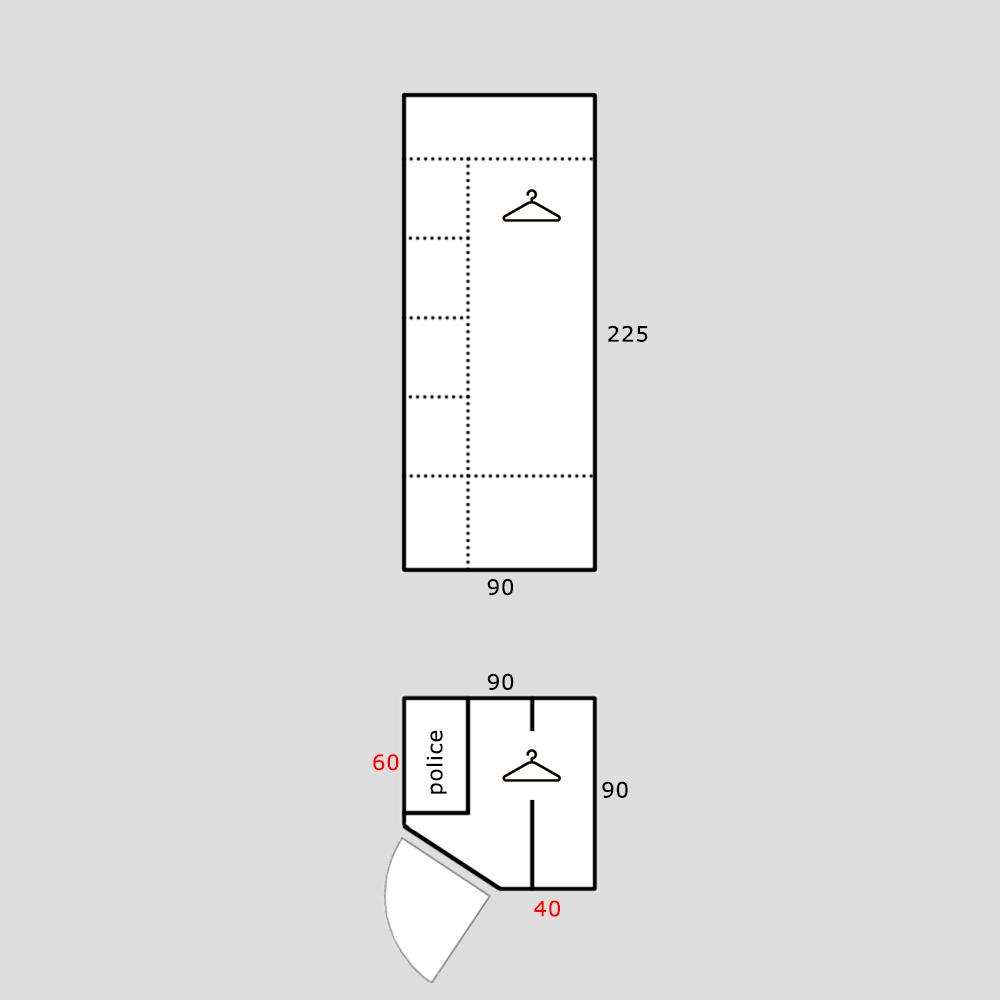 Skriňa vysoká 225 cm. Hĺbka skrine na ľavej strane je 60 cm, na pravej strane 40 cm. Ak si želáte vyskladať skriňovú zostavu s využitím rohu miestnosti prakticky a aj pekne, táto skriňa je pre vás to pravé.